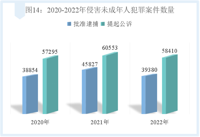 (1)侵害未成年人犯罪案件总量有所下降,但性侵案件仍呈上升趋势。2020年至2022年,检察机关批准逮捕侵害未成年人犯罪分别为38854人、45827人、39380人,同期提起公诉57295人、60553人、58410人,2022年批捕、起诉人数较2021年分别下降14.07%、3.54%。2022年,起诉强奸、猥亵儿童等性侵未成年人犯罪36957人,同比上升20.4%。
