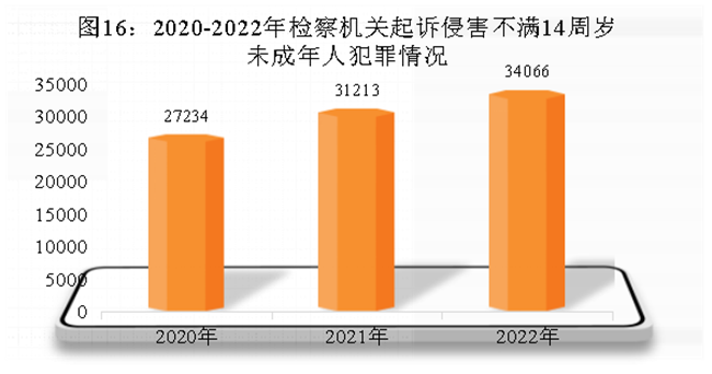 (3)侵害不满14周岁未成年人犯罪有所上升。2020年至2022年,检察机关起诉侵害不满14周岁未成年人犯罪人数分别为27234人、31213人、34066人,2022年较2021年同比升9.1%,反映低龄未成年人保护亟需加强。