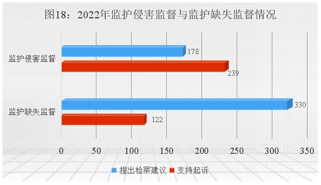 (2)主动开展监护缺失监督。2022年,检察机关就监护人缺乏有效监护能力,或者因客观原因事实上无法履行监护职责等监护缺失情形,依法妥善进行监护干预和保护救助,共提出检察建议330件,同比上升1.2%;支持起诉宣告失踪、宣告死亡122件,同比下降7.6%。