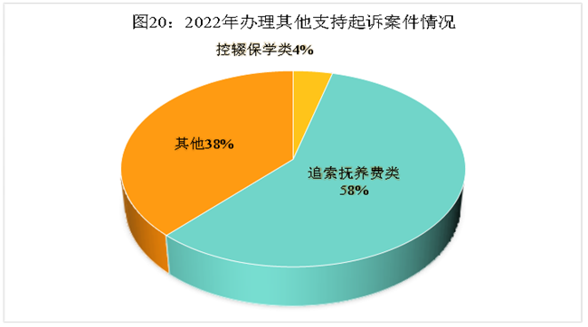 (4)积极开展支持起诉工作。2022年,检察机关共办理除监护权监督以外的涉未成年人支持起诉案件3368件,同比上升1倍。其中追索抚养费类1953件,控辍保学类136件,其他1279件。