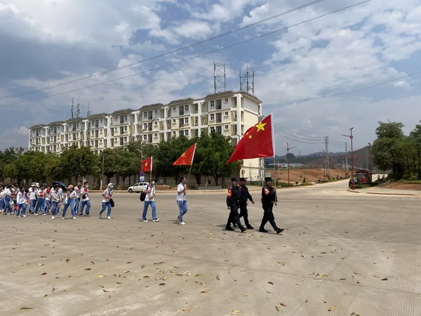 当日15时许,上百名师生手拿五星小红旗,排成长龙队伍,神采奕奕、头顶烈日,紧紧跟随着戍边移民管理警察的身后阔步向前行走在镇康县南伞镇边境巡逻道上。