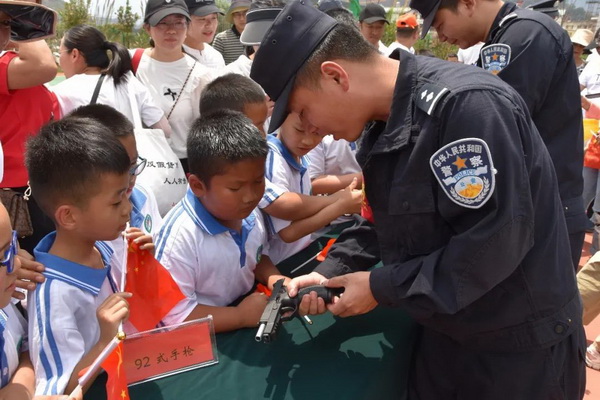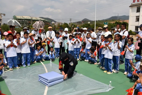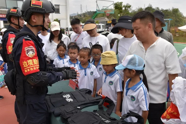 在南伞边境派出所125警务室篮球场上,民警向来队参观的师生和家长认真介绍了盾牌、警棍、手铐、头盔等警用武器装备的功能、结构和使用方法。