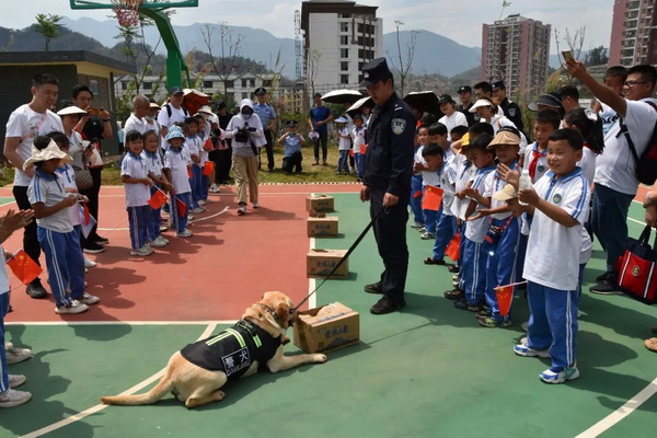 活动最后,民警还为师生家长展示了搜毒警犬的搜查技能,警犬优秀的表现和精准快速的搜查赢得到热烈掌声,到了互动环节时,同学们更是积极举手、踊跃报名,将搜索目标物品任意放在一个盲盒当中,都能被警犬快速而又精准的搜查出来。