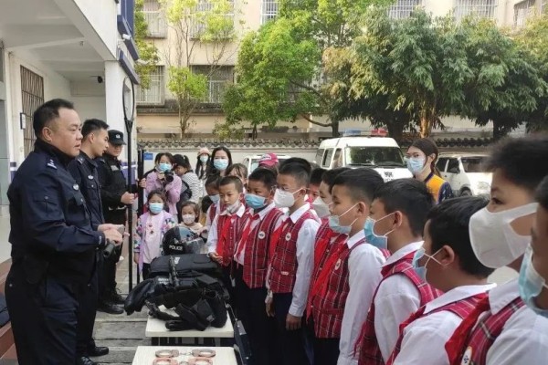 在普洱市公安局思茅分局南屏派出所,民警向受邀师生及家长介绍派出所日常工作及流程;展示了警车、防弹衣、警用盾牌、单警装备等警械装备,讲解用途和使用方法,并进行现场实操展示;通过知识问答的互动方式,民警讲解了如何正确拨打110报警电话及随意拨打110报警电话带来的危害和后果。
