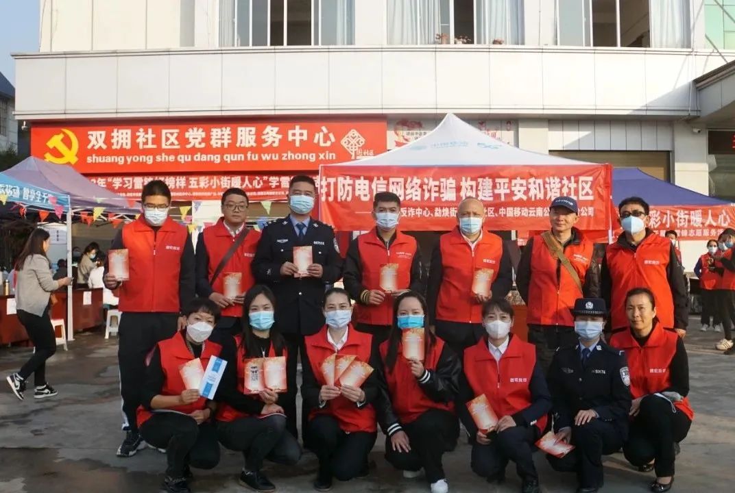 为深入开展学雷锋活动,进一步提高辖区居民反诈意识,扩大反诈宣传覆盖面,近日,德宏州反诈中心联合中国移动云南德宏分公司、中国人民银行德宏州中心支行、州民族文化工作团党支部、芒市公路分局、芒市勐焕街道双拥社区,以及进驻州反诈中心金融机构、运营商等10余家单位和部门,在芒市勐焕双拥社区开展以“学习雷锋好榜样 反诈宣传进社区”为主题的系列志愿服务活动,普及反诈知识,助力形成“全民反诈 全社会反诈”的浓厚氛围。