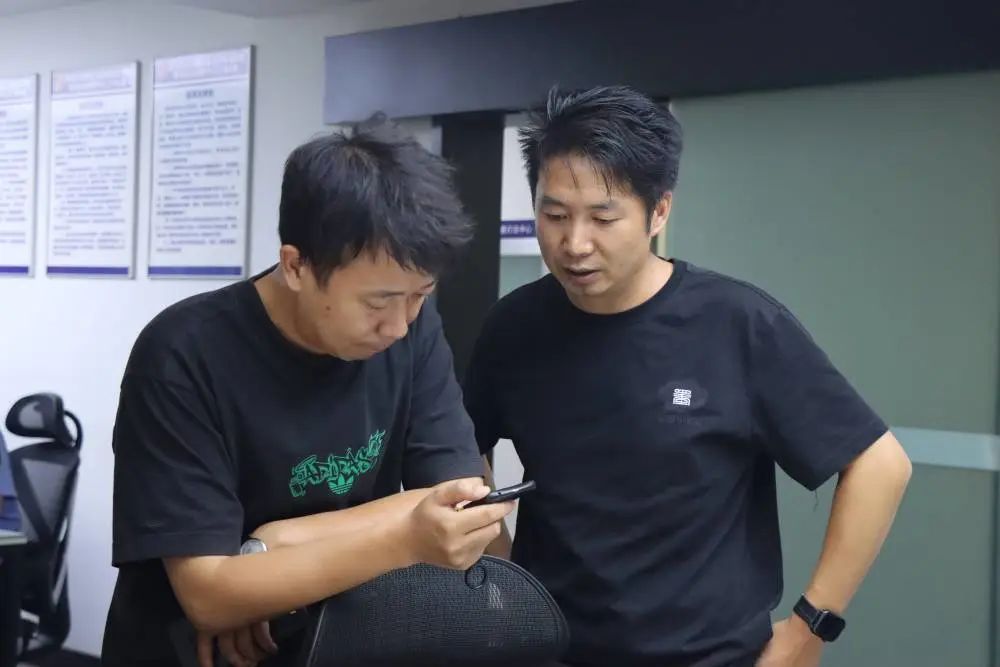 ▲中国移动嵩明分公司集团客户中心总监杨伟(右)与嵩明县公安局反诈中心民警马家查看AI智能反诈平台数据