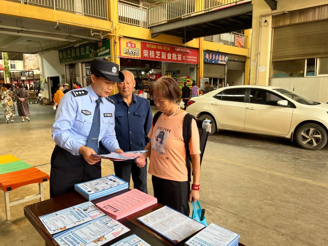 为将反诈意识深入群众心里,研和派出所民警联合街道及治安志愿者、网格员,在研和农贸市场“摆摊设点”,用通俗易懂的语言面对面向过往群众及经营商户详细讲解常见的投资返利、刷单诈骗、裸聊诈骗、冒充熟人等网络诈骗手段和防范技巧。
