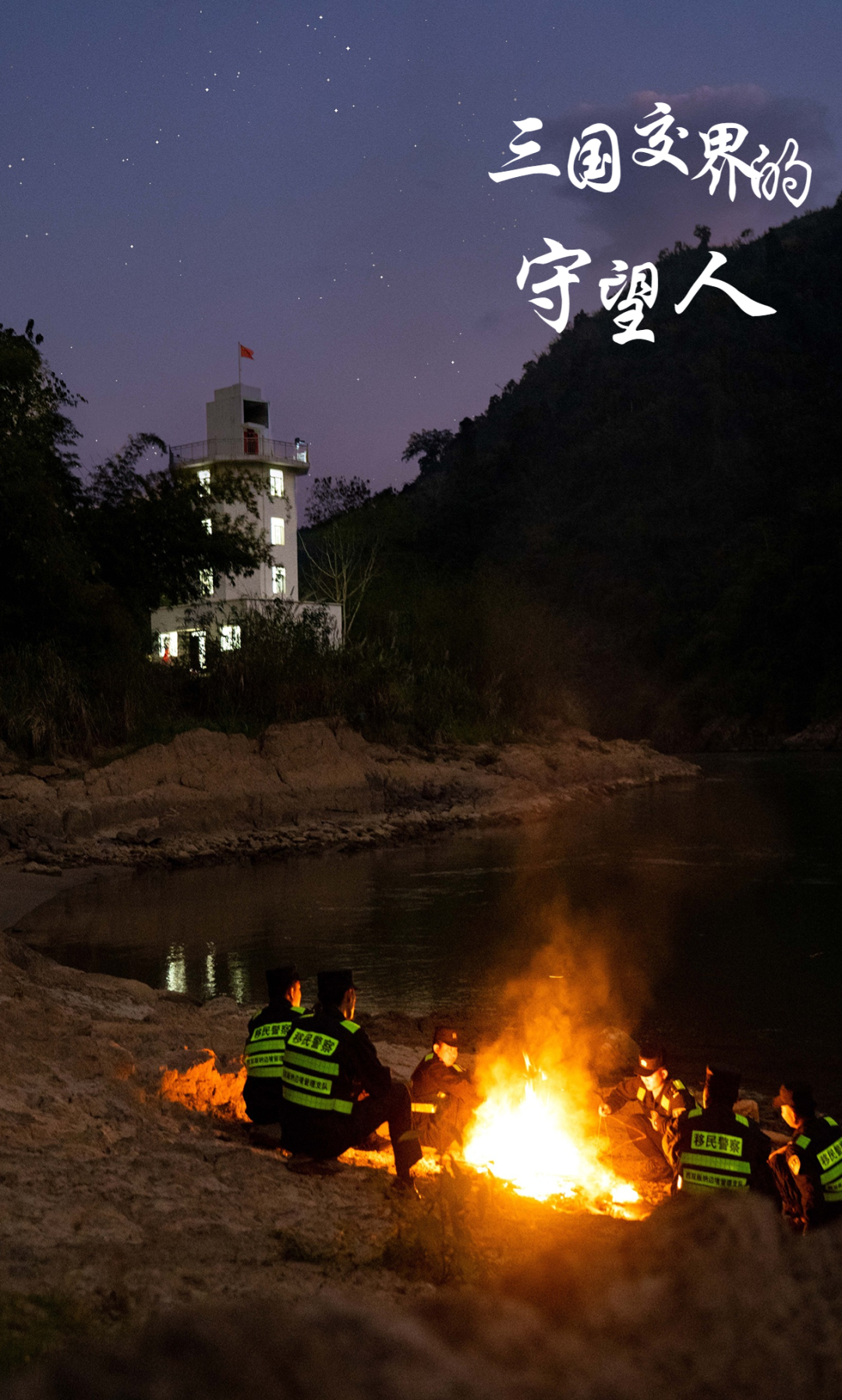 身后的瞭望塔很高大,承载着每一名移民管理警察守卫边境的愿望;身后的瞭望塔很渺小,小到让老宋跟所有的战友亲如家人。瞭望塔的灯光与篝火照亮边关的夜空,照在澜沧江上,成了一串串、一珠珠、一片片星星点点璀璨的灯火。