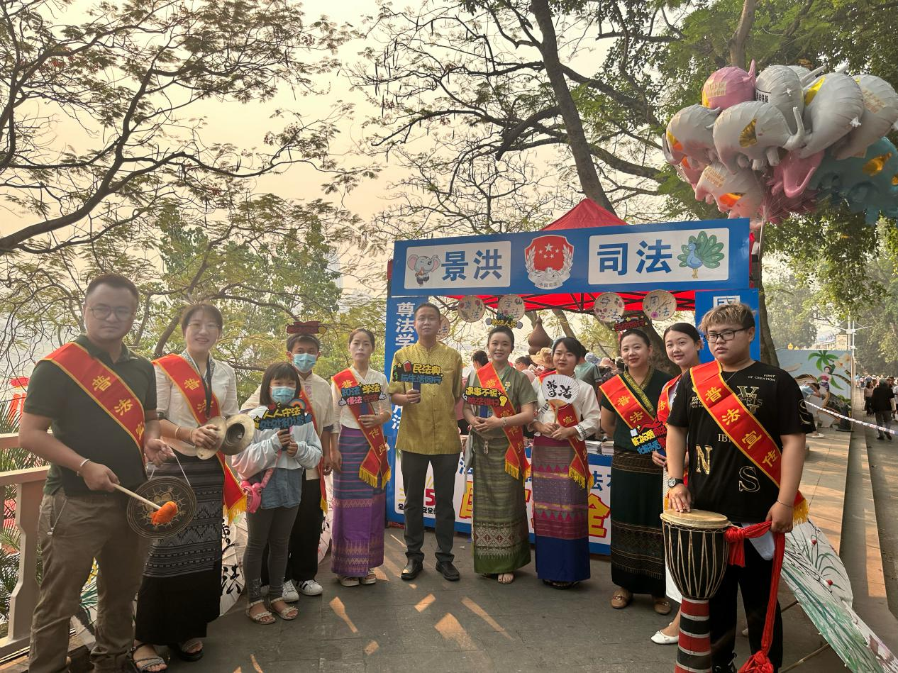 泼水节是傣族人民最隆重、最盛大的节日,近日,西双版纳州各族群众身着节日盛装,聚集到景洪市澜沧江观礼台参加庆祝大会。景洪市司法局趁着“双节”东风,以民族“五用”工作法在庆祝大会赶摆场上打造一桌“傣味”法治宣传大餐,“热情招待”全州各族群众及来自五湖四海的游客,给浓厚的民族文化节日庆典增添一份法治氛围。
