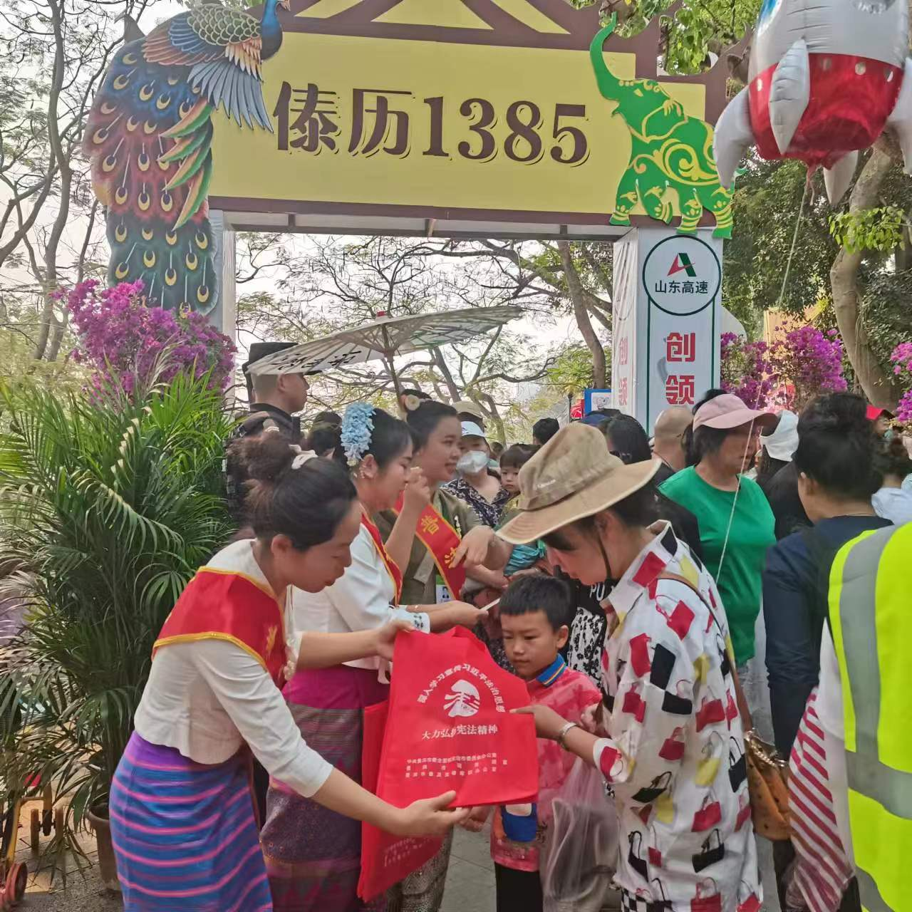 此次普法宣传活动以傣历1385年新年节—泼水节传统节日为契机,在赶摆场人群聚集的场所,通过设立法治宣传屋、展示傣族文化系列普法产品、文艺表演、现场讲法等方式,悬挂普法标语3条,发放《普法强基进万家读物》《国家安全人人有责》宣传购物袋等普法宣传资料8000余份、解答群众法律咨询30余人,受教育群众3.5万人次。