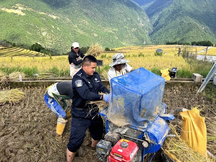 “阿叔,稻谷收割得怎么样了?有什么需要帮助的吗?”近日,丙中洛边境派出所民警深入田间地头,与村民热情地拉家常,了解村民稻谷收割情况。