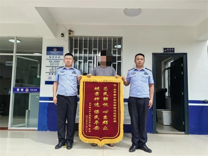 2024年8月8日,群众郭先生将一面印有“为民解忧 心系群众 破案神速 保民平安”的锦旗送到勐桥边境派出所。那天,接群众报警称某某矿场一辆挖机柴油被盗,希望民警帮助处理。接报案后,勐桥边境派出所民警立即前往现场开展调查取证工作,通过现场勘查车辆痕迹、走访周边群众、调取视频监控,结合大数据分析研判,民警最终锁定涉案车辆以及犯罪嫌疑人,仅用4小时就成功将犯罪嫌疑人抓捕归案。