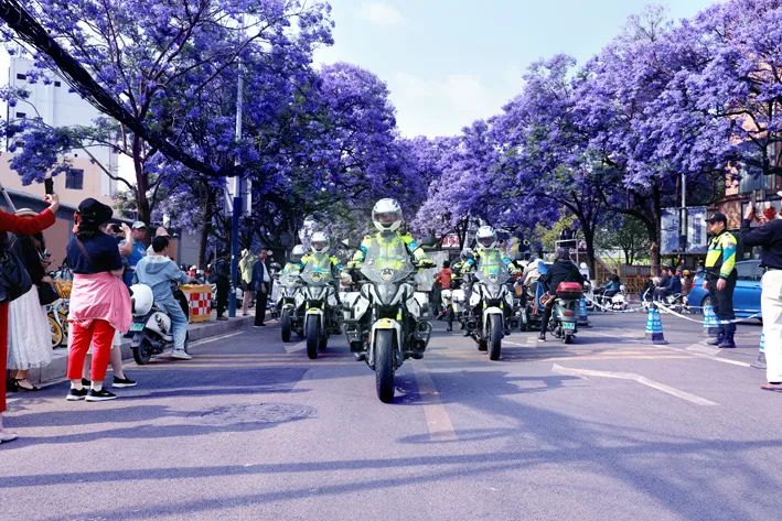 4月12日至5月31日,云南省昆明市第六届蓝花楹文化艺术节如约而至。每天8点,游客陆续到达教场中路,现场打卡拍照蓝花楹、逛本地生活美学市集、乘坐蓝花楹沉浸式赏花巴士,开始感受一场全新的花漾生活。而云南省昆明市公安局五华分局巡特警大队全队也早早抵达,全力护航游客安全赏花。