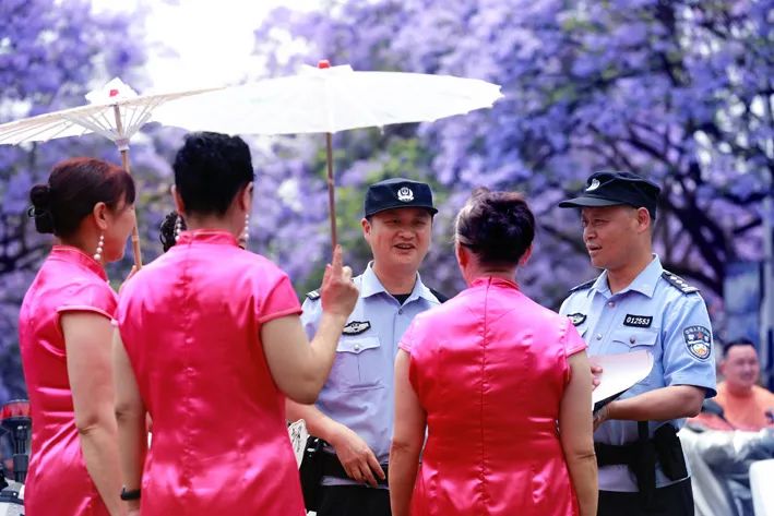 近期,五华区教场中路的蓝花楹成为昆明市“新顶流”,每天吸引着5万余人次前来“打卡”。面对参观客流增大、交通情况复杂、矛盾纠纷多发等情况,为保障赏花群众和道路行车安全,五华分局巡特警大队健全“立体巡防”模式,前移警务关口,全力护航蓝花楹文化艺术节期间群众安全的同时,为赏花群众提供24小时不间断暖心服务。