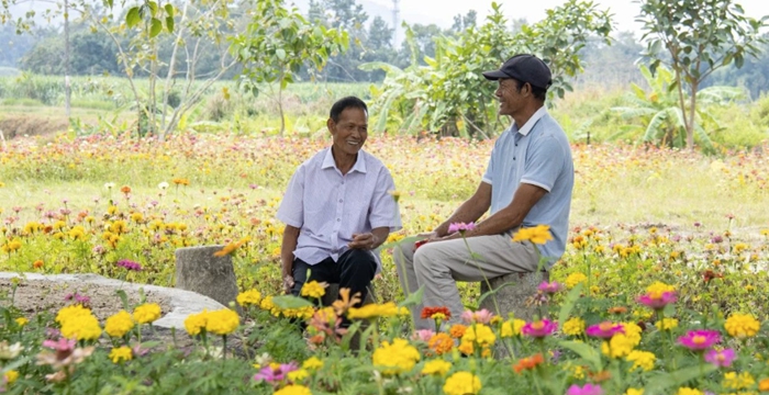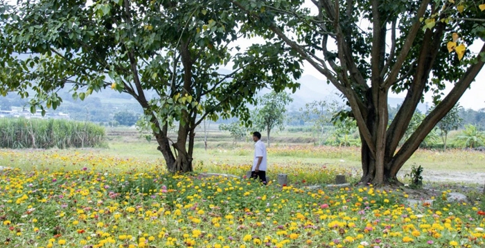 “空山新雨后,天气晚来秋。”晚秋的晚风吹拂着德宏州盈江县弄璋镇姐目村的砖房良田,在一场淅淅沥沥的小雨之后显得格外凉爽,天空放晴晚霞绯红,“咩八”(傣语:傣族大妈)聚在休闲广场舂着新米粑粑,刀保东大爷正同三三两两的人群走在广场一旁的小道上。看着步道两边开得正盛的菊花、格桑花,刀大爷忍不住说道:“你们看这些花开得多好啊,今年来我们村的环境变化太大了,像个花园似的。”大家都笑了,他们打心底认同刀大爷的说法。