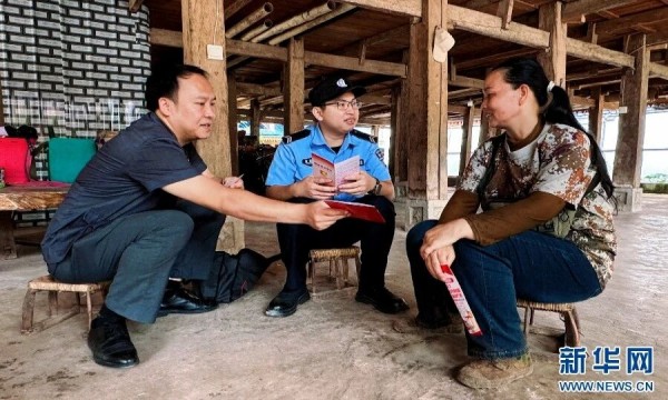 磨憨法庭副庭长易君宇进村开展普法宣传(10月14日摄)。新华网发(董入榕 摄)