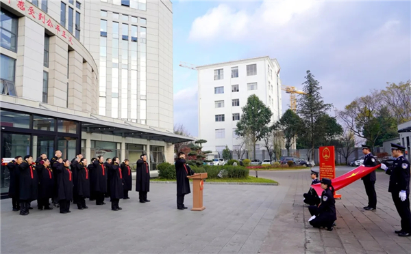 12月4日上午,富源县法院审判大楼前气氛庄重肃穆,金色的阳光映照在宣誓台上。全院法官身着法袍,整齐列队,面向鲜艳的五星红旗,举行宪法宣誓仪式。