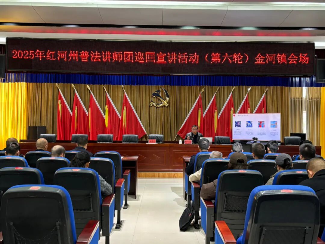 11月19日,红河州司法局、红河州普及法律常识办公室到金平县开展2025年红河州普法讲师团巡回宣讲活动(第六轮)。宣讲活动分两场次分别在金河镇、金平县教育体育局同时进行。