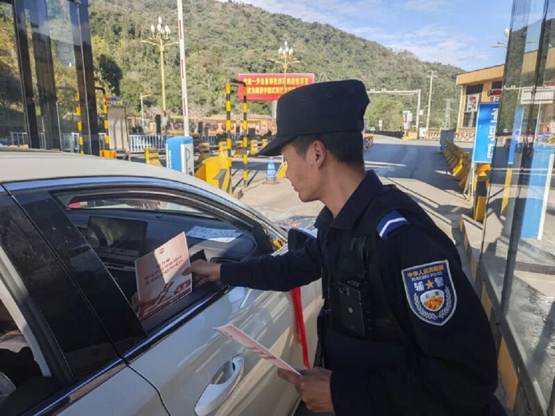 “师傅,跑长途辛苦,宪法里关于劳动者权益的条款,我带您了解下。”在岩甲边境检查站,每一声引擎的暂歇都成为一个微型的普法课堂。车辆停稳查验的短暂片刻,民辅警们通过“一分钟普法”便能精准传递法律知识。