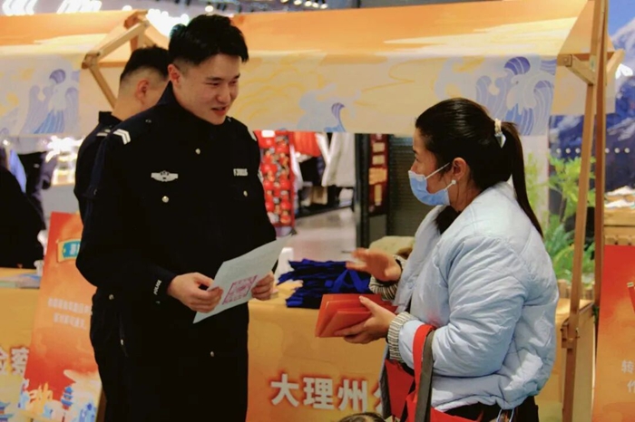 在非遗体验区,承载大理厚重历史的甲马拓印技艺被赋予全新法治内涵。州强戒所警官现场指导,带领群众体验法治元素甲马拓印,拓印出带有“国家宪法日”字样的甲马版画。这种“非遗+普法”的创意结合,使抽象的法律条文通过指尖技艺变得可知可感,让群众在感受非遗魅力的同时增强法治意识。