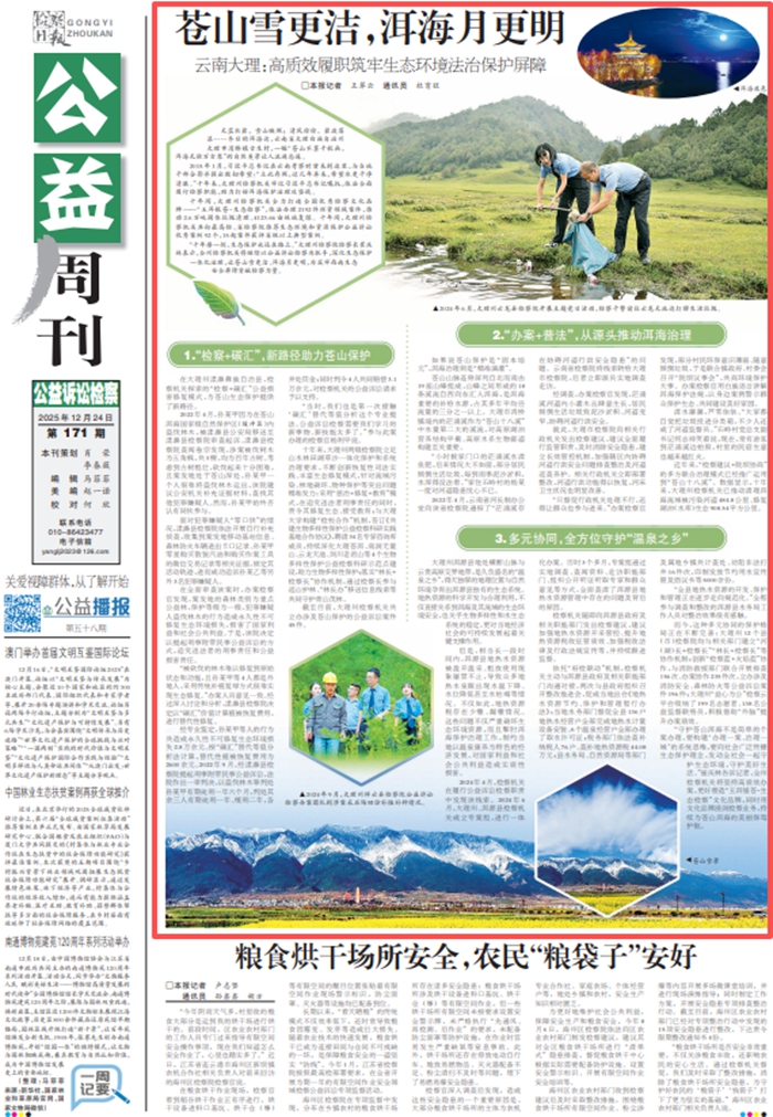 而今,这种多元协同的保护格局正在不断完善:大理州12个县(市)检察院均与相关部门建立“河(湖)长+检察长”“林长+检察长”等协作机制;创新“检察蓝+火焰蓝”协作,与消防救援部门联合开展排查156次、办案协作235件次,立办涉及消防安全、森林防火等公益诉讼案件196件;大理州“益心为公”检察云平台吸纳了199名志愿者、138名公益监督联络员,积极借助“外脑”提升办案质效。