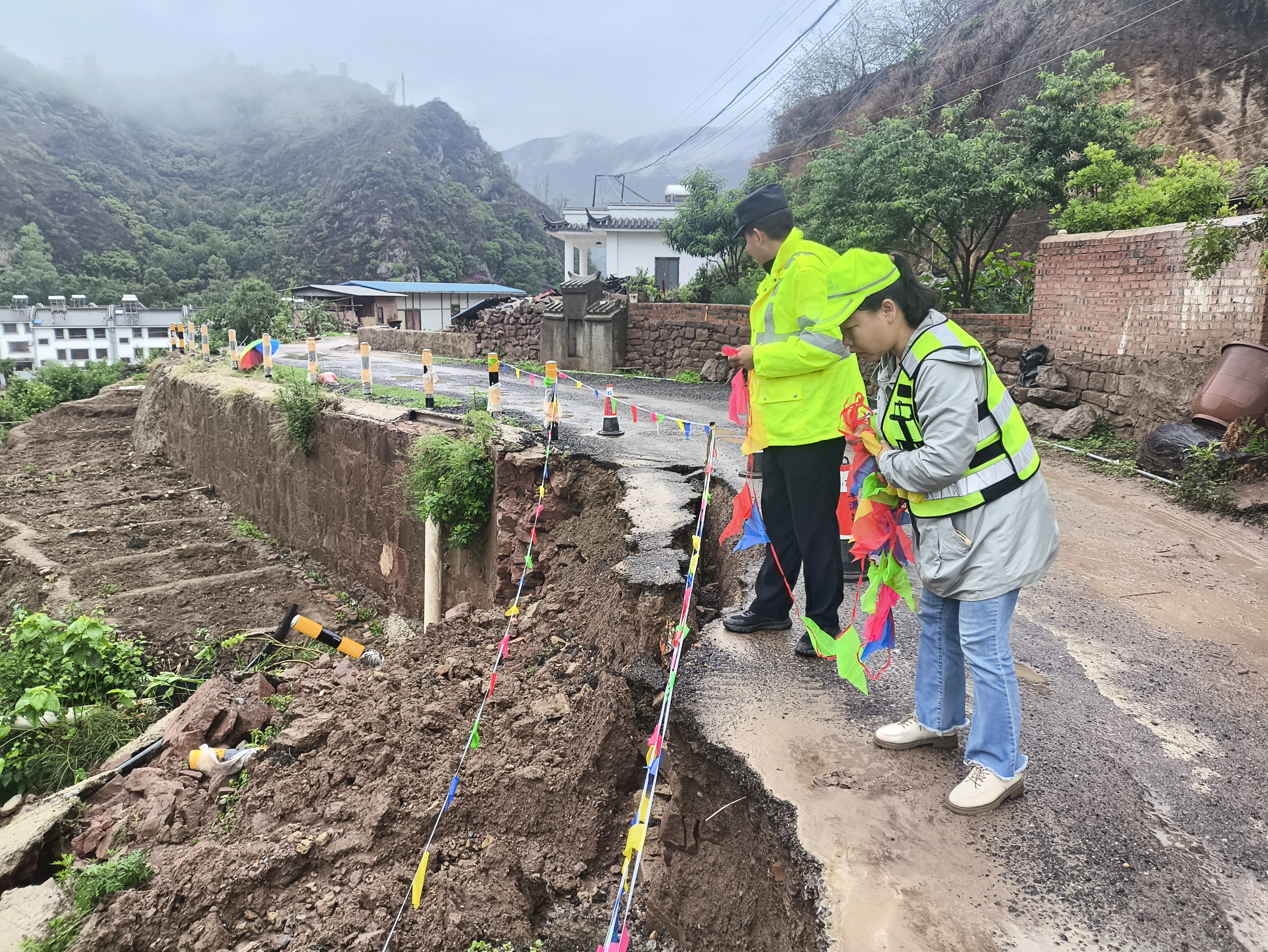 “小杨,快把锥桶往这边摆!”石羊派出所负责人抹了一把脸上的雨水,冲着正在搬运警示标志的交通安全劝导员喊道。5月30日上午,民警巡逻至石羊社区西关村路段时,发现一处转弯处路基被暴雨冲毁,形成近两米宽的塌陷带。“师傅您慢点!前面转弯处路塌了一半!”劝导员杨大姐挥舞着反光棒,拦住一辆疾驰而来的农用车。司机王师傅下车查看后倒吸一口凉气:“这要是晚上看不清,准得栽进去!”“咱们先用彩带、锥桶围住缺口,等联系县交通运输局工程队抢修。”民警话音未落,远处一辆面包车正朝危险路段驶来。“快!把锥桶摆成S形引导线!”众人冒雨在湿滑的路面上用警示锥桶筑起“生命通道”。