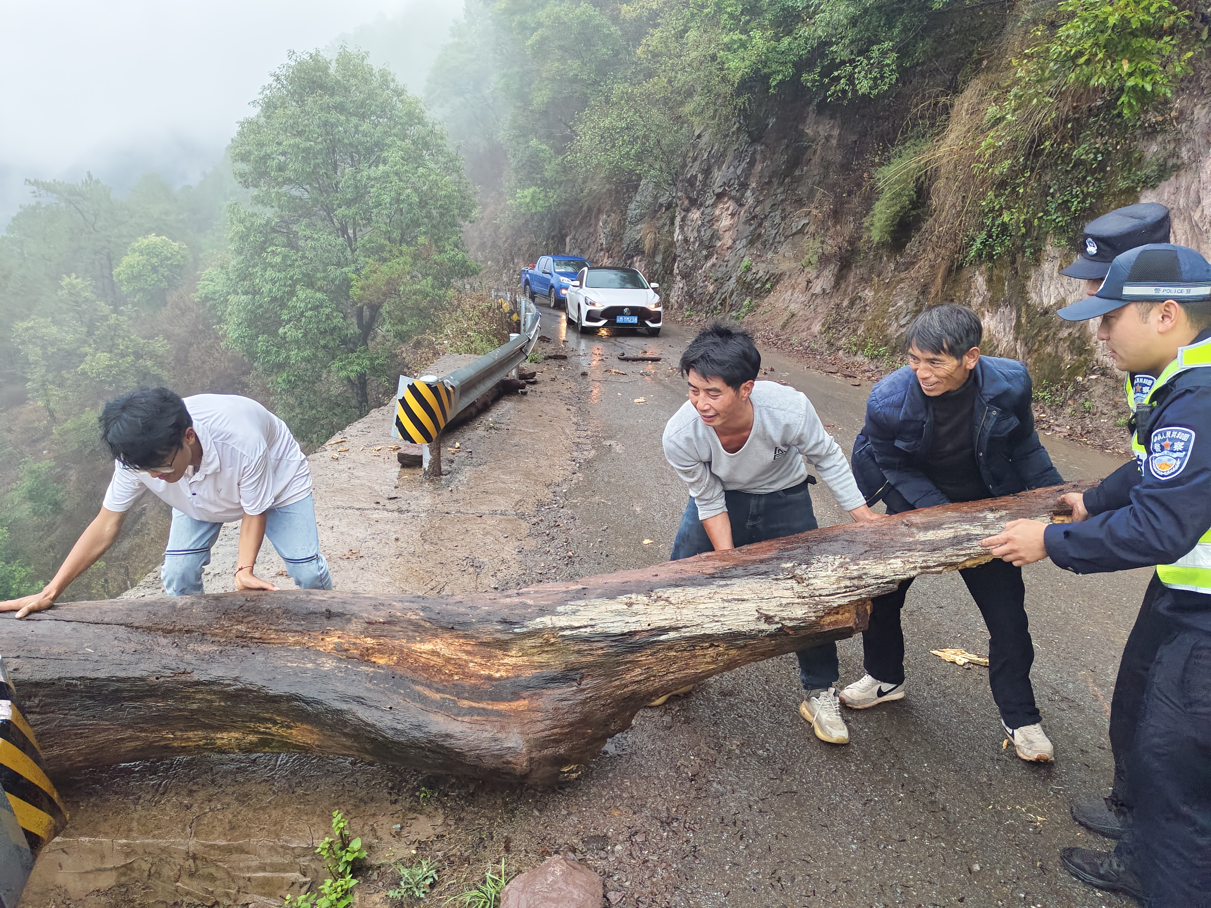 “轰隆!”5月30日下午,永河村公路传来巨响。铁锁派出所民警小姚接到村民急电:“进乡主路被一棵枯树封死了,有辆小轿车差点被砸中!”赶到现场时,司机老刘正对着横亘在路中央的树干发愁:“这树比腰还粗,我们几个汉子都抬不动!”雨点噼里啪啦打在警服上,派出所负责人抄起随车工具说道:“咱们分段处理!老刘你们护着妇女儿童退后,我们来抬!”“一、二、三!”随着整齐的号子声,民警们的手被树皮磨破,雨水混着木屑渗进伤口。经过两个多小时奋战,粗壮的树干被改造成临时护栏。“警察同志,这树杈子别浪费了。”村民李大姐送来热姜汤,“咱拿它当警示桩,让它也‘站岗’护平安!”