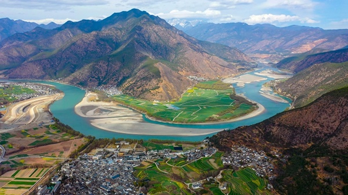 长江从青藏高原奔流而下,与澜沧江、怒江并肩在横断山脉中穿行,到玉龙县石鼓镇时突然转向,形成罕见的“V”字形河道,这便是“长江第一湾”。