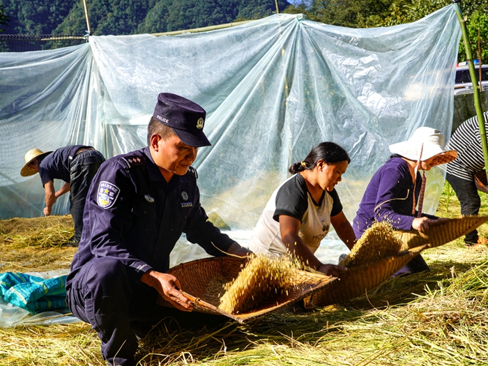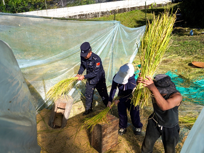 “木大哥,今年收成比去年还好啊!”民警笑着说道。木大哥捧着金灿灿的稻穗,满脸欣慰:“是啊,看着这一片稻浪,心里特别踏实。”民警辅警一边挥动镰刀收割稻谷,一边向村民普及禁毒、防骗、防盗等方面的知识。
