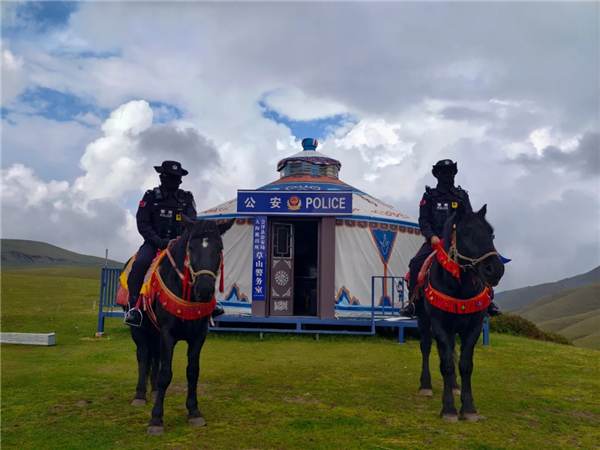 从服务群众的“最后一公里”到“零距离”,马鞍载着平安一步步走来。“这里没有平坦的公路,我们就跟着牧道走,这里没有便捷的补给,我们就把水壶、干粮、应急救援物资挂在马鞍上。”这是骑警队队员常说的一句话,也是他们服务群众的真实写照。在大海草山,骑警队的马匹不仅是巡逻的工具,更是载着服务与温暖的“移动平台”,把“远在天边”的警务服务,变成了“近在眼前”的贴心帮助。如今,骑警队队员在旅游旺季骑着马匹走进牧区、走到游客身边,发放安全提醒,讲解注意事项,让每一次的处警更加快速便捷。
