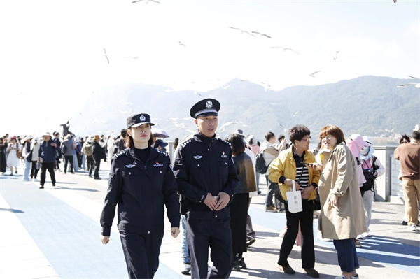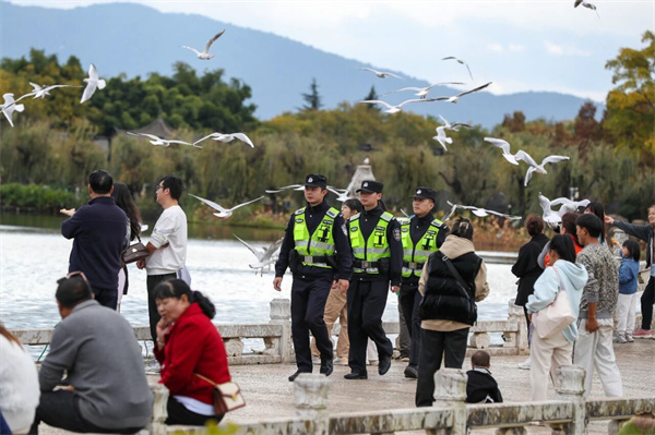 西山分局副局长介绍,在红嘴鸥栖息觅食区,分局以河湖警长制为抓手,整合警力与护渔员、春城“红袖标”治安志愿者等群防群治力量,构建“水陆空”“三位一体”巡防体系。今年以来,累计投入巡防力量600余人次,开展联合执法65次,清理渔网渔具150余具。在西山风景区、大观楼、草海绿道等游客密集区实行“一景区一方案”,依托客流监测实施柔性引导和前置分流,通过深化“情指行”一体化机制,实现纠纷、走失等警情快速处置。在商圈治理方面,创新“三层三叠加”防控机制,云纺、好悦天地片区治安警情下降16.6%,南亚商圈刑事警情下降20.61%,游客安全感和满意度持续提升。
