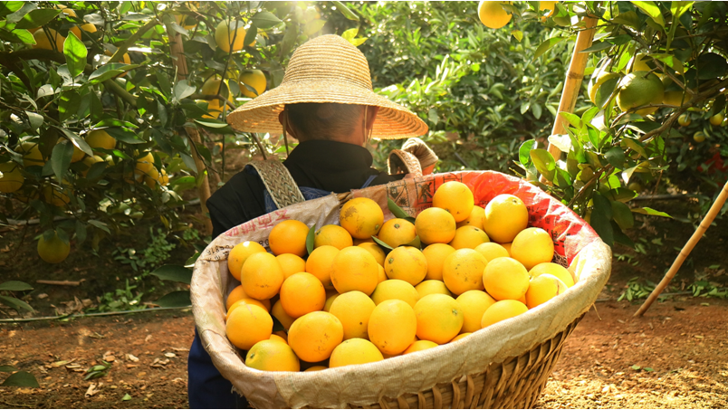 新平县依托哀牢山独特的垂直立体气候和生态环境,发展出了20余万亩柑橘园,产量高达40余万吨,产值17亿余元。今年11月,绵延的“橙林”在阳光下泛着金黄光泽,冰糖橙又迎来一年丰收季。