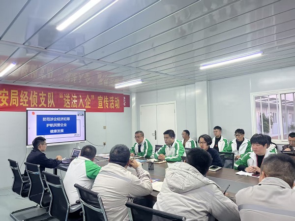 在曲靖经开区德方纳米公司,经侦支队民警开展“送法入企”活动,以“防范企业经济犯罪 护航民营企业健康发展”为主题,为到场员工进行宣讲。