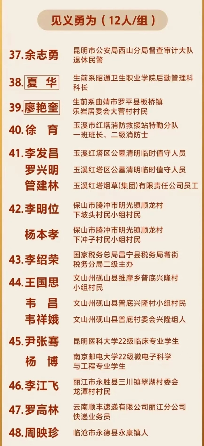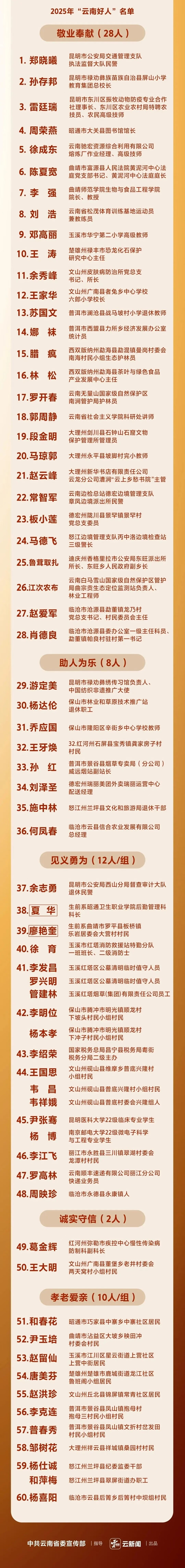 经各地各部门推荐、专家评审、事迹展示评议等环节,中共云南省委宣传部发布2025年“云南好人”名单,共60人(组)入选。其中,12人(组)见义勇为人员入选2025年“云南好人”。