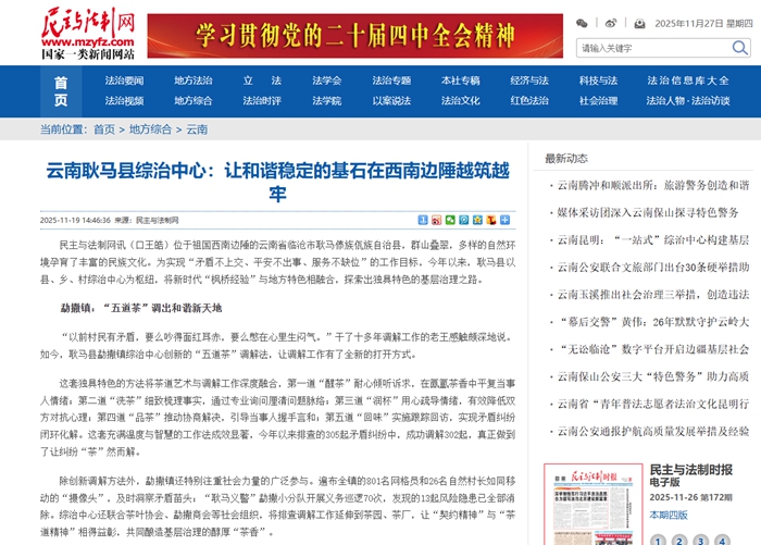 位于祖国西南边陲的临沧市耿马县,群山叠翠,多样的自然环境孕育了丰富的民族文化。为实现“矛盾不上交、平安不出事、服务不缺位”的工作目标,今年以来,耿马县以县、乡、村综治中心为枢纽,将新时代“枫桥经验”与地方特色相融合,探索出独具特色的基层治理之路。