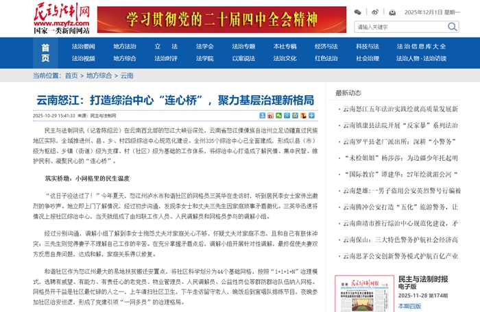 从社区网格的精细服务,到机制创新的高效运转,从民族特色的调解智慧,到温情兜底的民生关怀,怒江州通过四级综治中心的规范化、实体化建设,成功架起了一座座贯通党委、政府与各族群众的“连心桥”。这一座座桥梁,正持续为怒江的长治久安和高质量发展注入源源不断的治理动能。