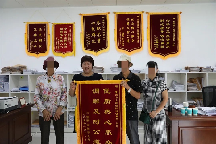 结案10天后,老两口及其子女特意送来锦旗。这面满载谢意的锦旗,与调解室里其他锦旗交相辉映,如同边疆法治晴空下又一颗温暖的星。当傍晚阳光透过窗户在锦旗上投下斑驳的光影,肖玲正望着锦旗出神——她或许在思考,下一个案件的“公平公式”该如何书写。