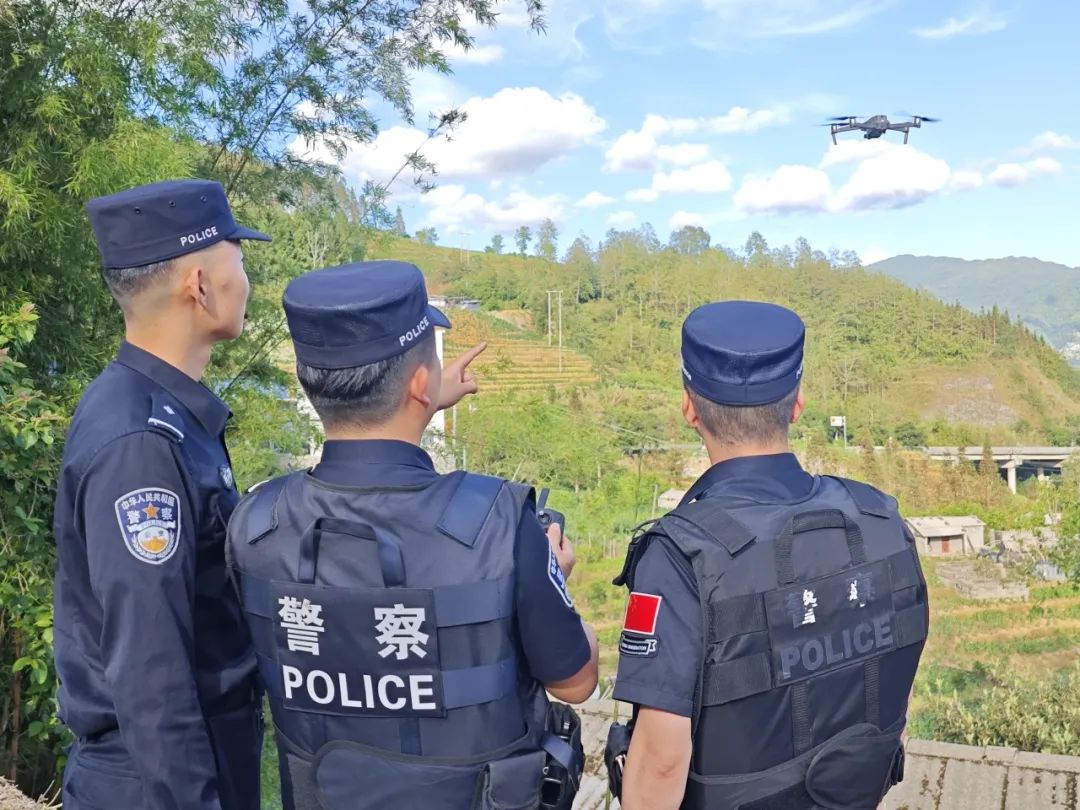 图为颜鑫(中)使用无人机采集执勤点周边信息
