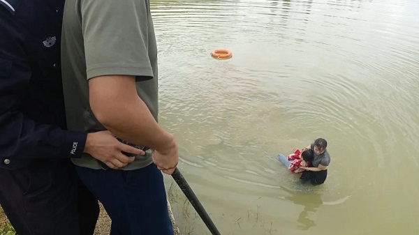 宽阔的水面,李丽仙拼尽全力将女孩往岸边拖拽。两道身影越来越近,出警队员立即抛来绳索、木棍等工具,将两人拉上岸。