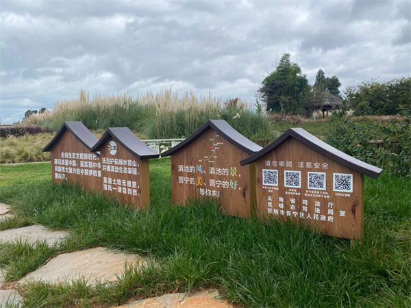 立足滇池绿道“生态景观带、市民休闲带、文化展示带”的独特定位,紧抓时下群众“爱看”“爱拍照”的喜好,以颜值吸引、故事共鸣,打造“好看”的普法阵地;挖掘传统村落的历史底蕴和文化内涵,突出打造具有互动性和参与感的法治产品;精心设计能够满足游客“爱拍照”诉求的法治产品,让群众自发分享,实现裂变式传播。针对常规法治文化阵地建设中习惯采用静态展示,导致常规化法条化语言很难转化这一传播短板,晋宁区司法局提出了“讲好‘生态文化+法治宣传’普法故事”的目标,将民间传说整理编撰成法治文化故事,群众可通过二维码扫码收听,以现代科技手段提高了法治产品的互动性,让游客自发成为法治文化的传播者,实现了法治宣传从“灌输式”向“体验式”的转变。