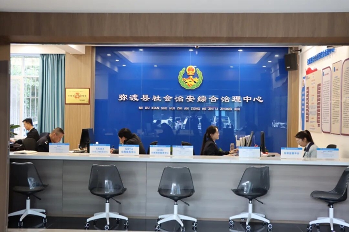 弥渡县综治中心设在中共弥渡县委政法委,按“1+3+6”模式设置功能区域,“1”即1个群众接待大厅;“3”即3个分区,包括登记受理区、指挥调度区、多元化解区;“6”即6个功能室,包括分析研判室、指挥调度室、调解室、信访接待室、心理咨询室、预未工作室。中心汇聚了县公安局、县人民检察院、县人民法院、县司法局等8个常驻单位以及县妇联等8个轮驻单位的工作人员,形成协同作战的强大合力,服务范围涵盖矛盾纠纷化解、公共法律服务、信访接待、心理服务、治安防控以及预防未成年人违法犯罪等领域。