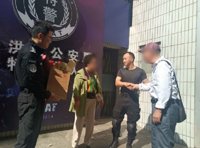2月2日上午,被救助老人的家属怀着感激之情,带着一封感谢信和一束鲜花来到该大队,向执勤队员们表达衷心的感谢。