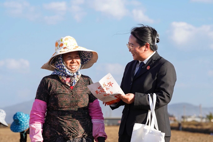 勐遮法庭副庭长代卫华对正在干农活的村民发放普法宣传册及宣讲法律知识