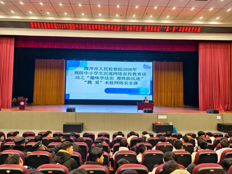法治润心田,护航伴成长。为筑牢未成年人网络安全防线,引导青少年树立正确网络观,近日,保山市腾冲市人民检察院“腾·爱”未检干警走进腾冲市第一职业高级中学汽修系,以“拒绝沉迷,智慧成长,网络不是法外之地”为主题,为500余名汽修专业学子送上一堂干货满满、温情满满的法治宣讲课,以检察温度守护少年逐梦路。
