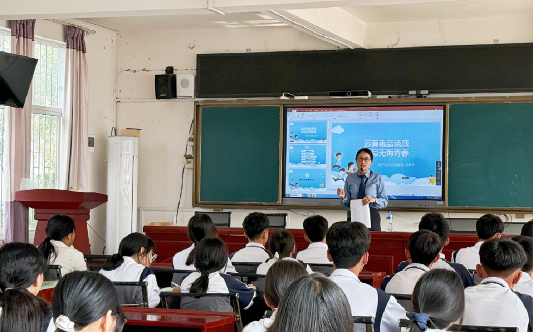宣讲课上,“花腰姐姐”结合办案实践,用朴实的语言,结合涉毒典型案例,为同学们详细讲解传统毒品、合成毒品的种类与危害,拆解其伪装套路和识别要点,让同学们在沉浸式学习中认清毒品陷阱,掌握防毒拒毒实用技巧。同时,通过播放禁毒宣传片段、案例深度剖析、现场互动问答等形式,直观揭示毒品对个人身心健康、家庭幸福和社会稳定的多重危害,让同学们清晰认识到“毒品就在身边,防范刻不容缓”。课堂最后,“花腰姐姐”将法治精神融入仪式,与在场学生一起进行禁毒宣誓,进一步强化法治教育实效。
