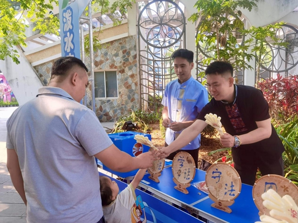 近日,西双版纳州景洪市花卉园“在树下集市”人声鼎沸,粽香混着花香,泼水节的欢乐在榕树林间荡漾。熙攘的节日摊位中,一个特殊的“法治赶摆亭”悄然开张:没有商品叫卖,却有“法律干货”免费派送;没有歌舞表演,却有互动问答和笑声不断。