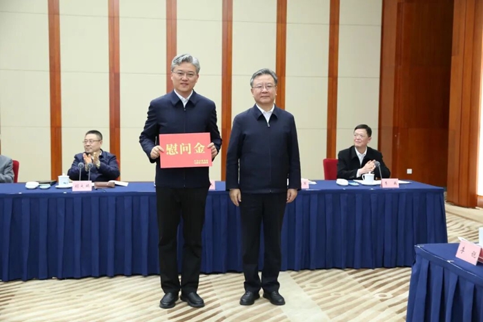 李俊杰颁发慰问金,张宏伟、张相军、汤问参加慰问。