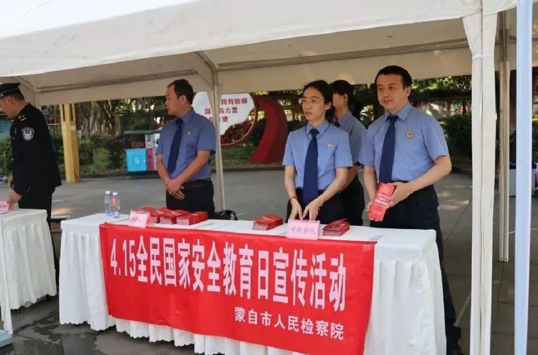 4月14日,红河州人民检察院、蒙自市人民检察院在蒙自市南湖北路南湖广场,联合开展“4·15”全民国家安全教育日宣传活动。