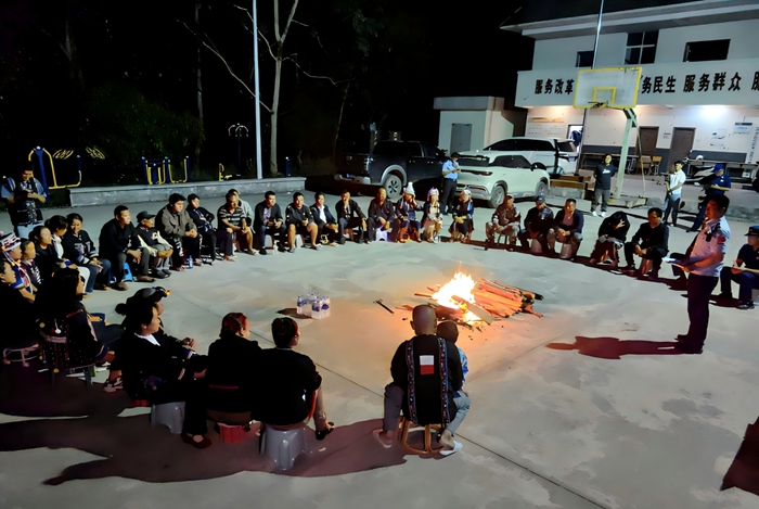 为切实压实重点村整治责任,进一步筑牢边境安全防线,近日,由西双版纳州景洪市景哈乡边防和平安法治办牵头,联合乡党群服务中心、景哈边境派出所及综合行政执法队(专职消防队、消防工作站)、重点村驻村工作队到土鲁村委会搭亥新寨村小组,与村民围坐火塘、促膝长谈。一场以“防范跨境违法犯罪”为主题的“火塘夜话”温情开讲,让法治声音浸润边寨民心,用初心担当守护边境安宁。