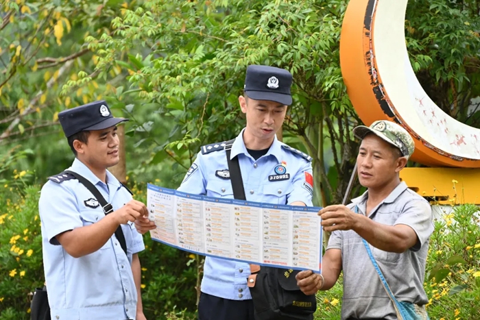 普法服务队民警以面对面宣讲、典型案例剖析的方式,向群众普及国家安全、边境管理相关法律法规,重点讲解偷越国境、走私、帮信等违法犯罪的危害与后果。同时,民警通过发放普法手册、张贴宣传海报,把法治知识送到群众身边,推动形成“人人关心国家安全、人人守护边境安宁”的良好氛围,与群众携手共筑边境安全坚固防线。